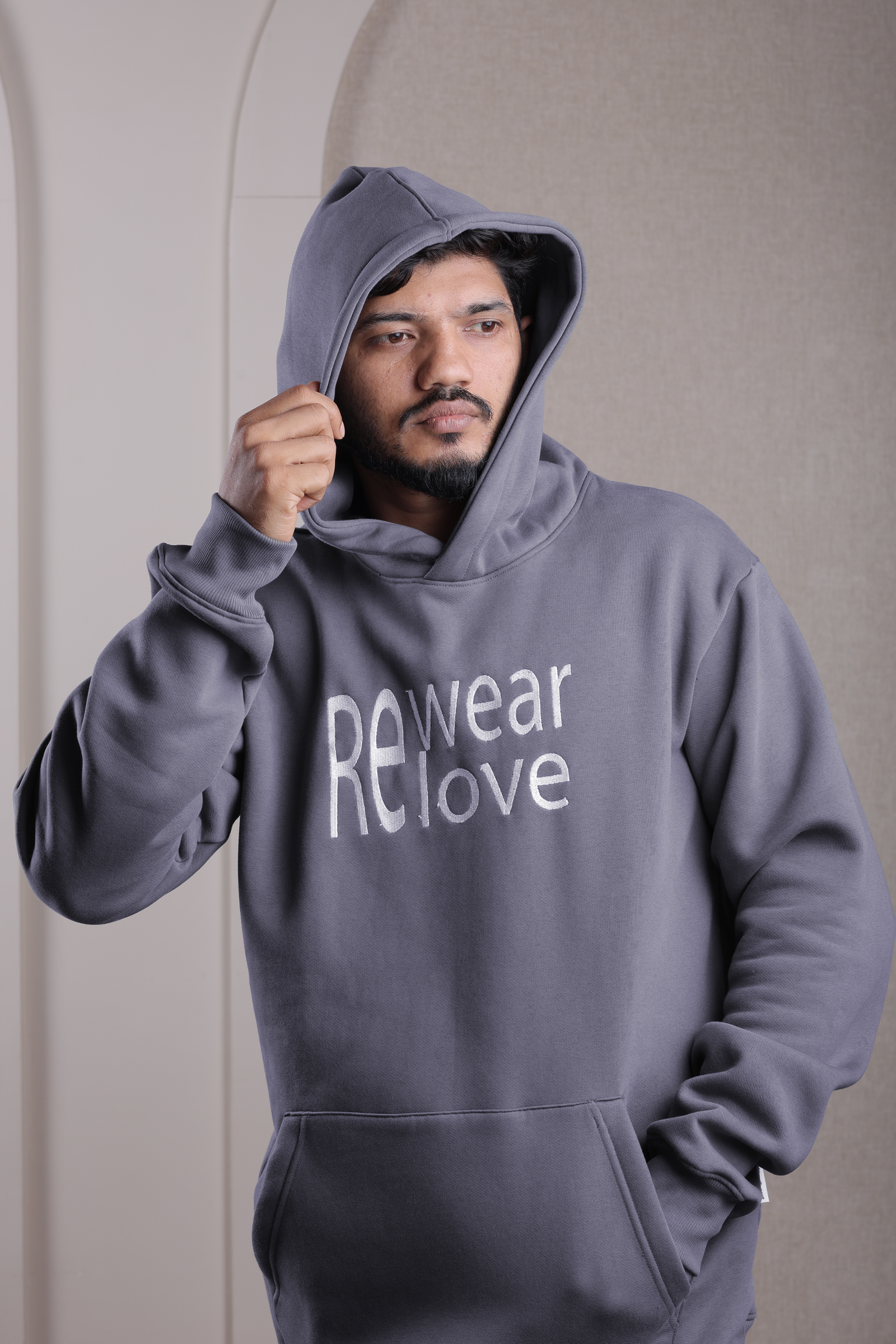 Embrace sustainable style and ultimate comfort with our "REwear RElove" hoodie. Crafted from premium, eco-conscious fabric, this charcoal grey hoodie is more than just a piece of clothing – it's a statement of mindful fashion. The front proudly features an elegant white embroidery of the slogan "REwear RElove," reminding us to cherish and extend the life of our garments. Designed for a versatile, relaxed fit, it offers a cozy yet stylish silhouette perfect for everyday wear, lounging, or making a conscious statement.