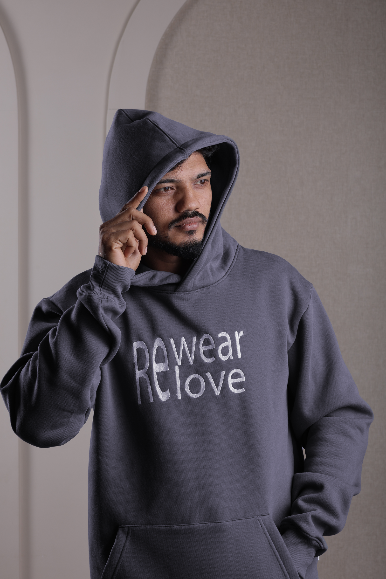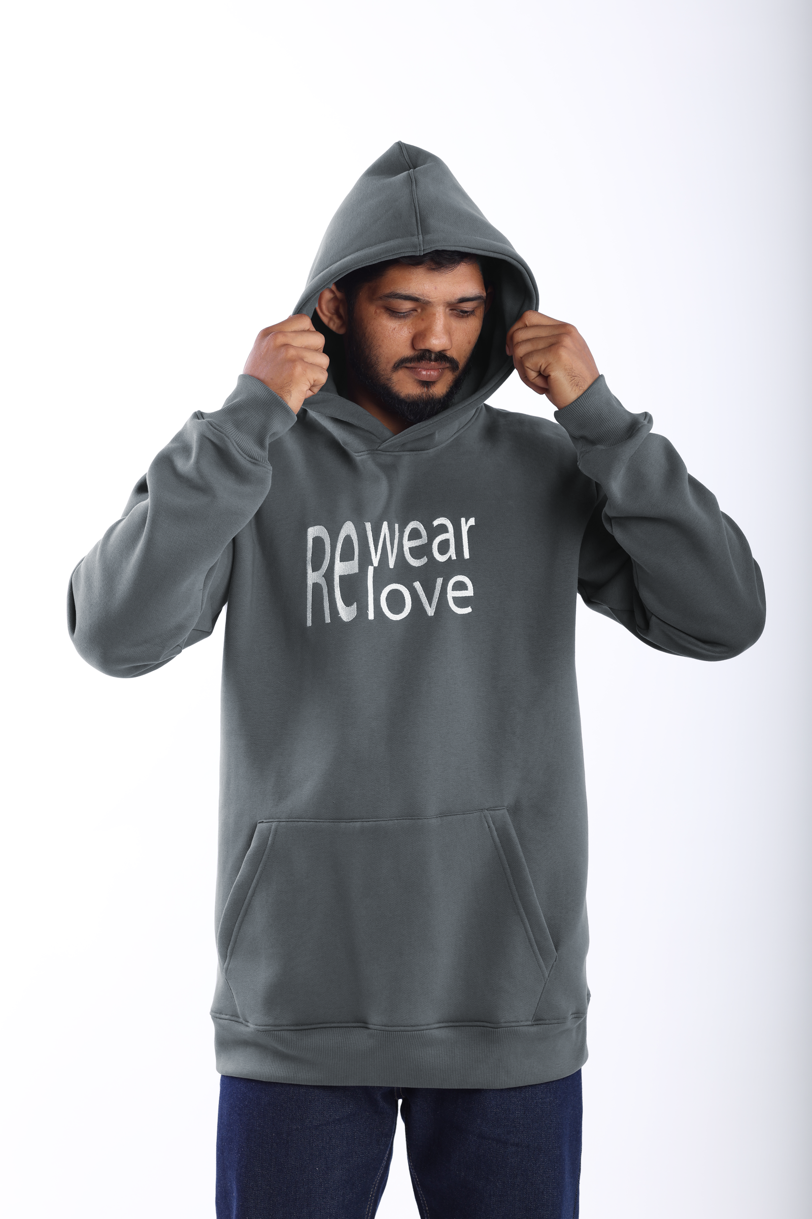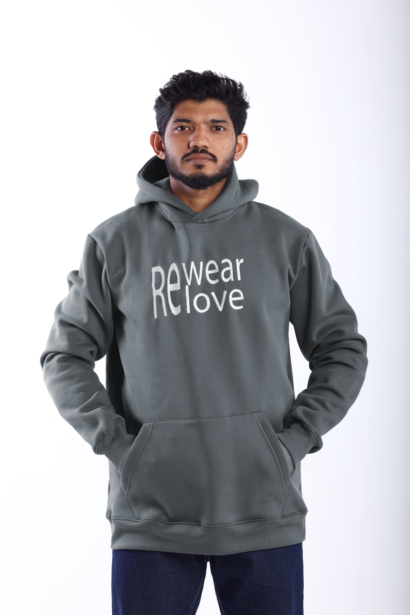 Slogan Embroidery: Prominent, Distinctive “REwear RElove”, Comfortable, Flattering, relaxed and easygoing silhouette without being overly baggy, Generous, Comfortably long sleeves, Snug Resilient ribbed cuffs with classic kangaroo pocket, Clean, Structured ribbed straight hemline.